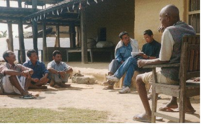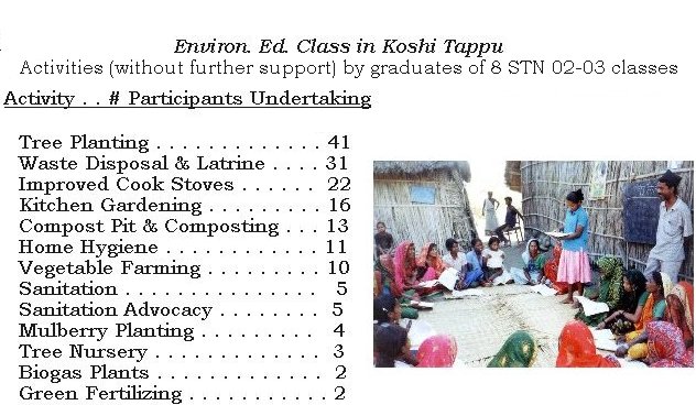 Educating from experience: ![]() In 2004, SeedTree gave greater priority to education. Our intern, Pashupati Chaudhary (right), completed his term at our home office, and with support from Debley Foundation and Environmental Data Research Foundation he was able to supervise SeedTree Nepal field work in his native Chitwan, Nepal. Pashupati's analyses of our field data, gathered over a decade, led to his thesis: "Ecological restoration approach to biodiversity conservation, human economy and health: a case of SeedTree" and to his securing a Masters Degree in Sustainable International Development from Brandeis University. ![]() ![]() Pashupati's study also revealed the remarkable impact of our rural environmental education classes (above left). Participants become self-motivated to practice more ecological living. We extended classes beyond Chitwan into Dang in the West and Koshi Tappu in the East, a new district for us. There the Sardar women (above right), who at first would cover their face and hesitate to talk with men, now are regularly participating in class and discussion. Badi women in Dang learn more wholesome livelihoods than their caste trade of prostitution. Besides our continuing tree-planting program (revitalized this year in all branches by Working Assets' $7000 support), we focused in Chitwan on classes, followed by micro-credit, sustaining graduate's ecological initiatives. The demand for classes is coming from diverse regions, including urban areas, and other countries as well. Dharmaraj Dhongal of the Institute of Agriculture and Krishna Mohan Shrestha of the Institute of Forestry (IOF) have recognized its potential and agreed to collaborate in revising our class manual (right) to better serve more diverse regions of Nepal. ![]() Pashupati interviews a locally revered healer (left) regarding medicinal plant uses. Pashupati's interest in the data from our group discussions, sharing the traditional values and uses of species, prompted other studies. For example, STN Coordinator Bishnu BK, with guidance from IAAS Prof. Dhongal, complied the incidence of uses of different species by two major ethnic communities, finding the indigenous Tharu recognized more uses of local plants than did the predominantly Brahmin community, immigrated from hill region. Bishnu has since, also published several articles in 2004 in agricultural magazines and newspapers, based on findings from our work. While Pashupati offered some suggestions, including the need for more staff; we are duly proud of his overall assessment: "SeedTree-Nepal has been doing a lot with a little investment, offering high rate of return compared to many other non-governmental organizations existing countrywide.... I found strength of SeedTree on its strategy of implementing the program activities through groups. The program activities have brought about tremendous changes not only in the ecological condition, but also in social and economic conditions of the people." Integrated Human Ecology Project: